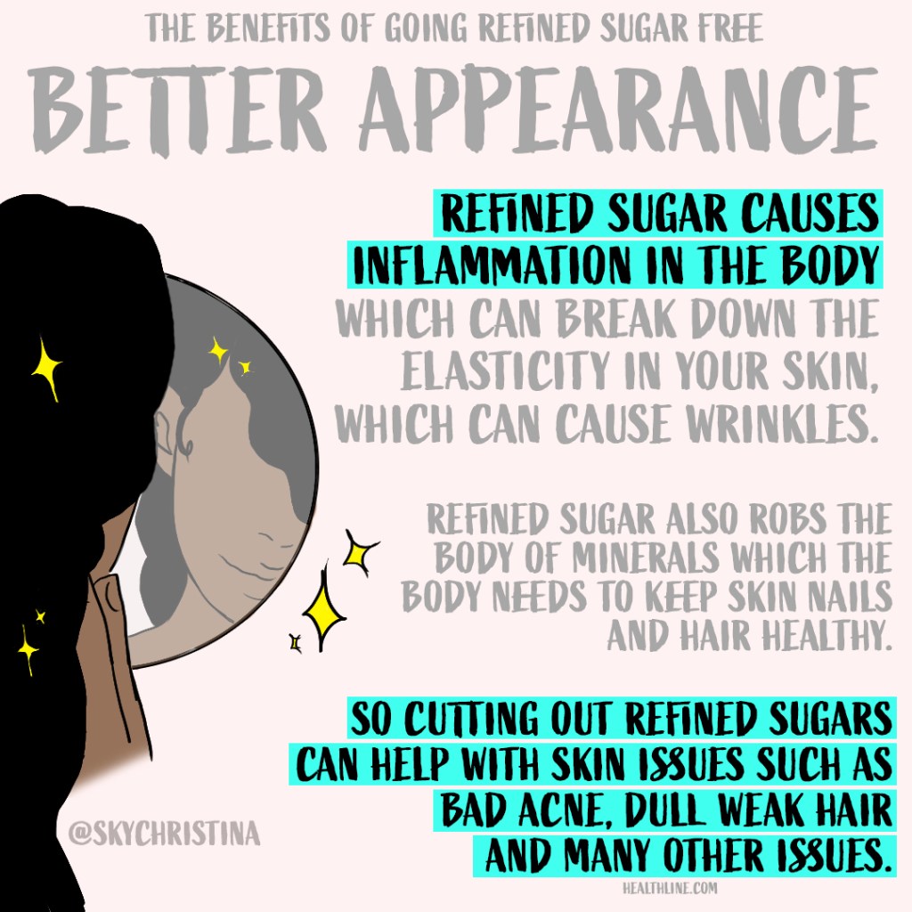 Refined Sugar causes inflammation in the body which can break down the elasticity in your skin, Which can cause wrinkles.