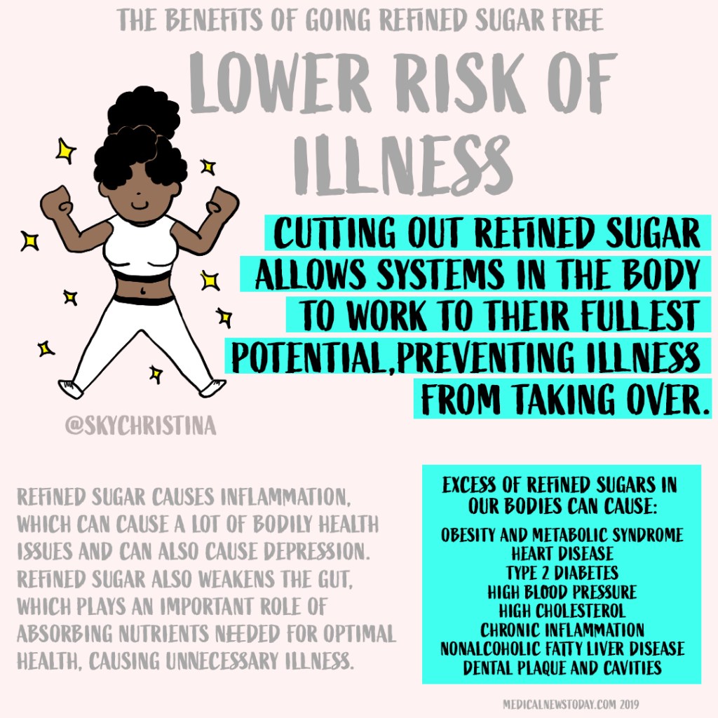 Cutting out refined Sugar allows systems in the body to work to their fullest potential, preventing illness from taking over. Refined Sugar causes inflammation, which CAN cause a lot of bodily health issues and can also cause depression.