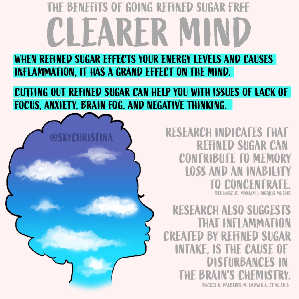 Cutting out refined Sugar can help you with issues of lack of focus, anxiety, brain fog, and negative thinking.