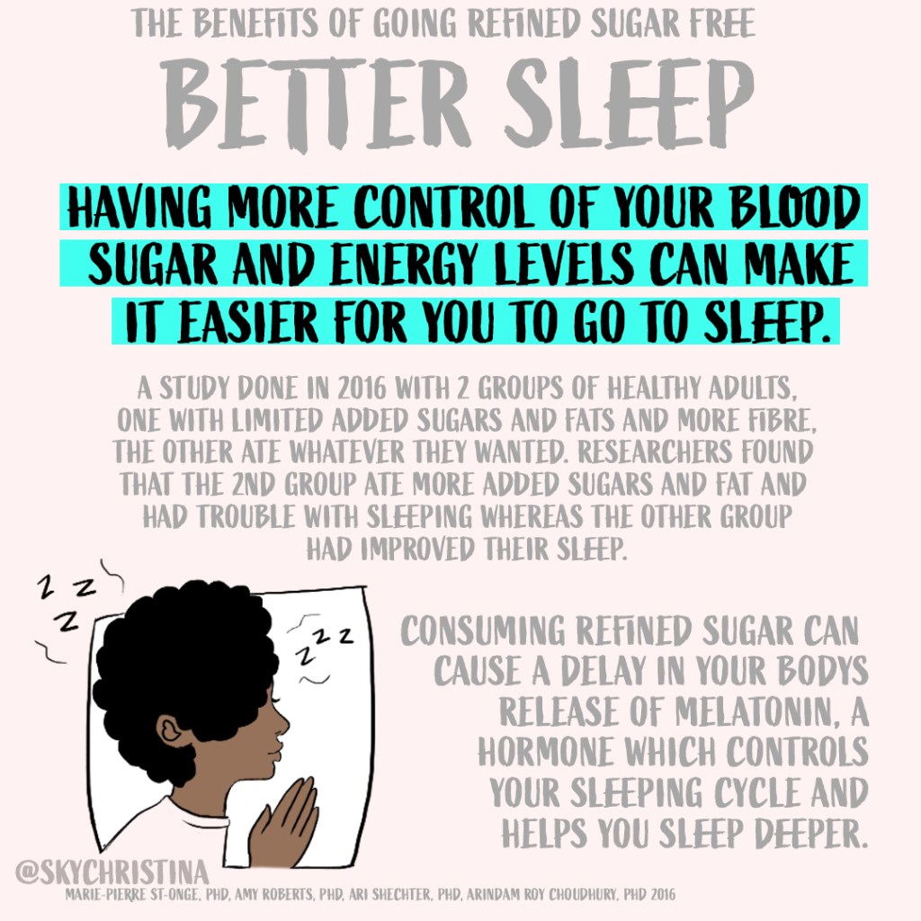 Consuming refined sugar can cause a delay in your body’s release of melatonin, a hormone which controls your sleeping cycle and helps you sleep deeper.