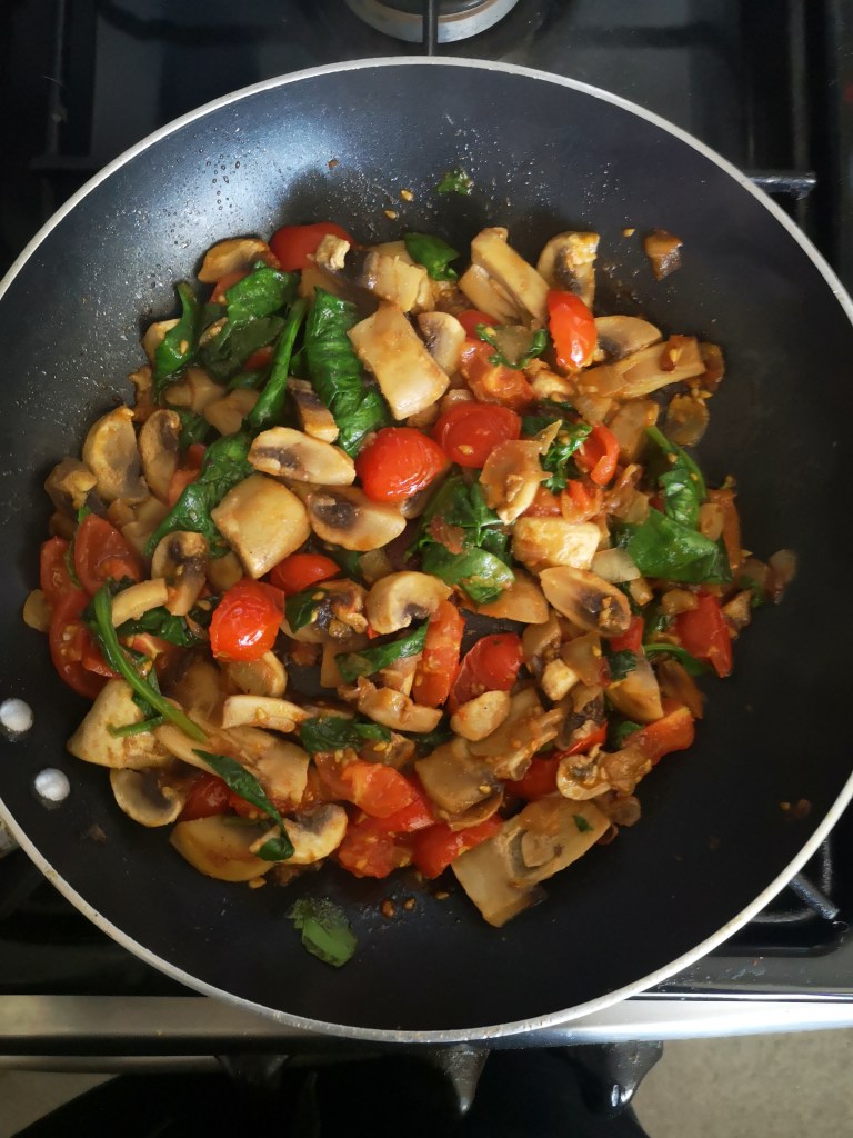 - Add Chopped tomatoes to pan and cook till juices mix with mushrooms and onions (around 2-3 minutes).